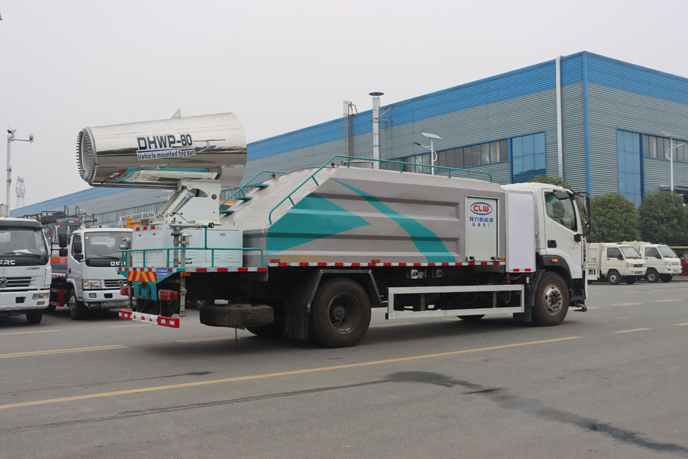 四、其他說明: 福田純電動多功能抑塵車是在純電動二類底盤的基礎上,加裝低壓沖洗、灑水系統、霧炮機組,由機械、液壓(氣路)、電器三部分合為一體的專用灑水作業車。 采用自吸式雙級離心泵,效率高、灑水寬度大、水槍射程遠,低壓水泵由底盤變速器取力器通過傳動軸直接傳動。霧炮機組由底盤電池帶動霧炮風扇電機、不銹鋼多級離心泵,進行噴霧降塵工作。