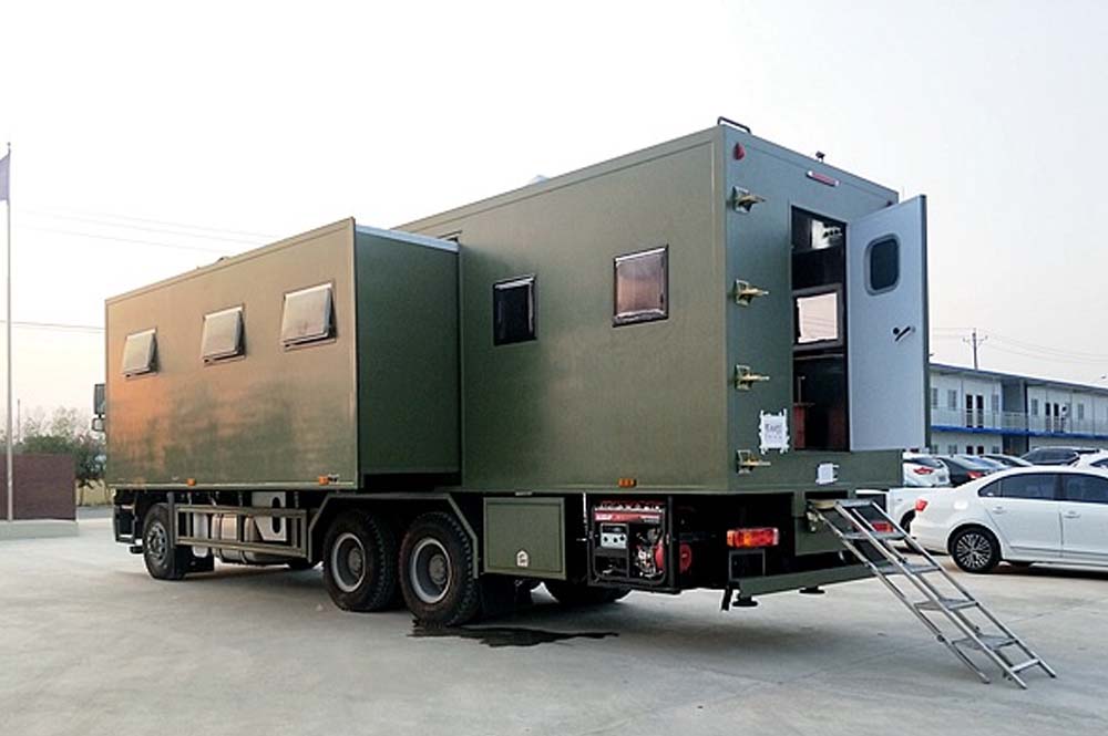 主要專用裝置發電機,折香床鋪等,選裝配置衛浴間、凈水箱、外掛式空調、衛星天線、吸頂電視、換氣扇、車廂左、右可選裝擴展機構箱體、車廂左、右兩側、后部增加或封閉窗戶、車門、車輛顏色可選裝裝有具有衛星定位的行車記錄儀等,不擴展可供8-12住宿,擴展后可供8-28人住宿。(可根據客戶要求改裝